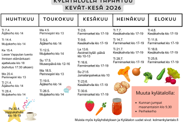 Tapahtumakalenteri keväälle ja kesälle on vihdoin valmistunut! Esite jaetaan myös kyläläisille postilaatikkoon lähiaikoina. Mikäli et saa omaasi, tule noutamaan itsellesi kopio Kylätalolta.